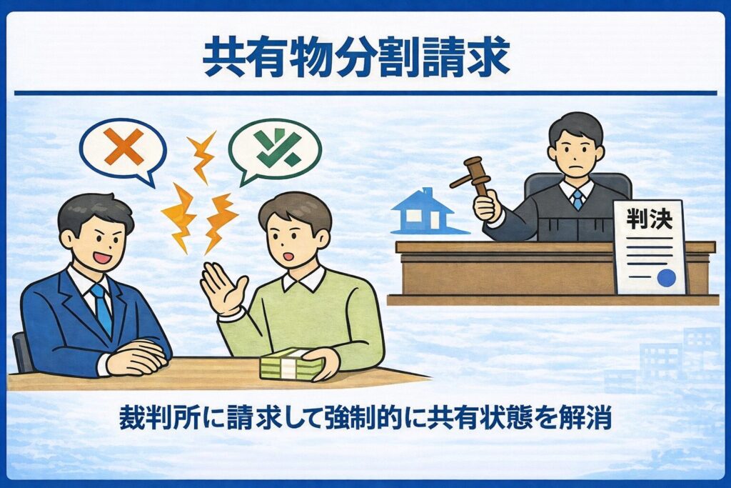 共有物分割請求訴訟とは、他の共有者との任意交渉が成立しない場合に、裁判手続を通じて共有関係を解消し、持分の取得や売却を実現するための訴訟です。