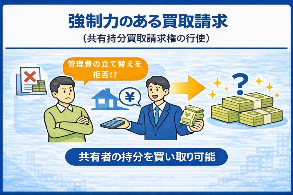 他の共有者が管理費を立て替えた場合、立て替えた共有者は支払いを拒否している共有者の持分を、対価(相当の償金)を払って買い取ることができます(共有持分買取請求権、民法253条2項)。
