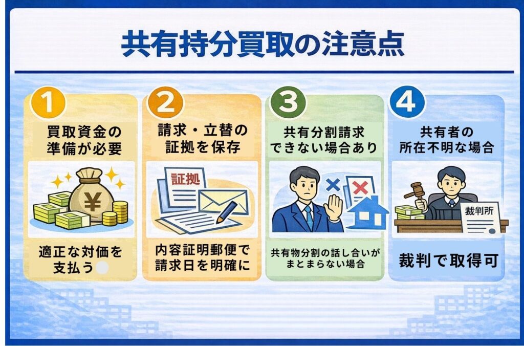 共有持分の買取を行う場合に注意すべき事項があります。