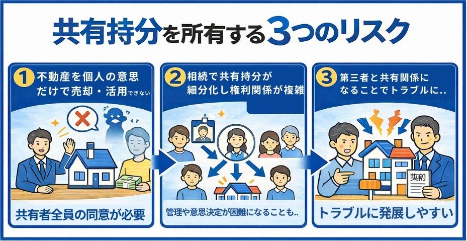 最大のリスクは「相続による細分化」と「第三者介入」:相続で共有者が増えると合意形成が困難になり、持分売却で見知らぬ第三者が入りトラブル化しやすい。