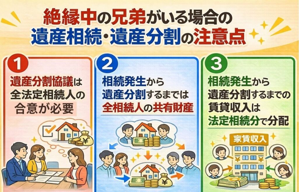 絶縁した兄弟との遺産分割協議で、トラブルを避けるための対策について解説しました。