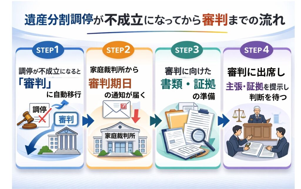 調停が不成立になると、手続きは自動的に審判に移行し、裁判官の判断により強制的に遺産が分割されます。