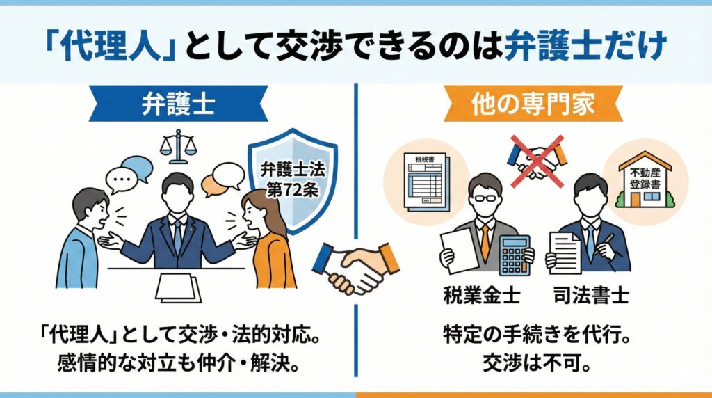 他の専門家が特定の「手続き」を代行するプロである一方、弁護士は「代理人」として、交渉の最前線に立つことができる唯一の国家資格者です。